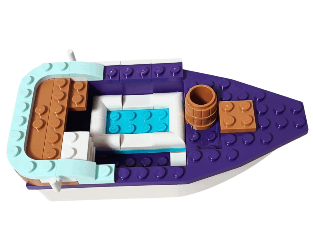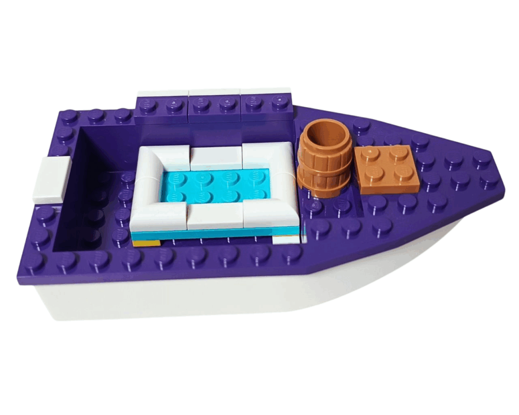 大きなベースパーツに、少しずつデッキや座席を組み立てていくと、海遊びにぴったりの楽しいボートが形になっていくの。
